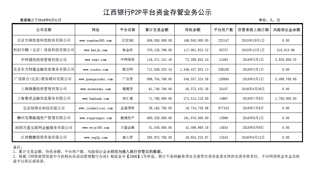 江西銀行P2P平臺資金存管業(yè)務(wù)公示(8月)