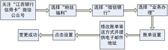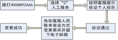 為響應國家綠色金融的號召,倡導節能環保理念,同時提升賬單送達時效,自2017年1月起,我行將全面取消紙質賬單,免費向持卡人發送電子賬單,客戶可以通過信用卡客服電話(4008892666)、微信銀行、手機銀行等渠道變更賬單寄送方式。具體流程如下: