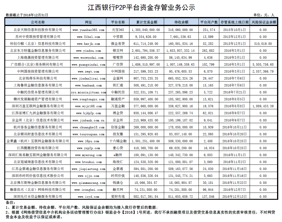 江西銀行P2P平臺資金存管業務公示(2016年12月)