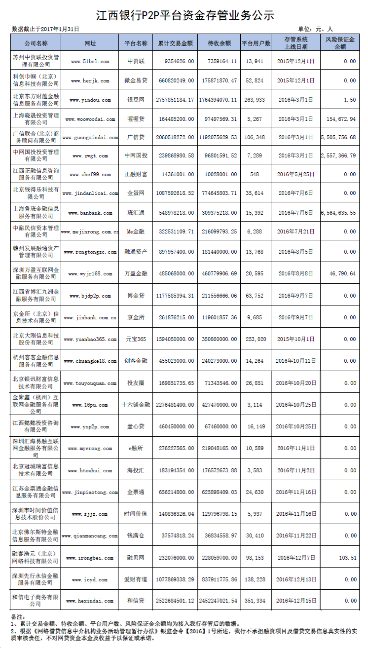 江西銀行P2P平臺資金存管業務公示(2017年1月)