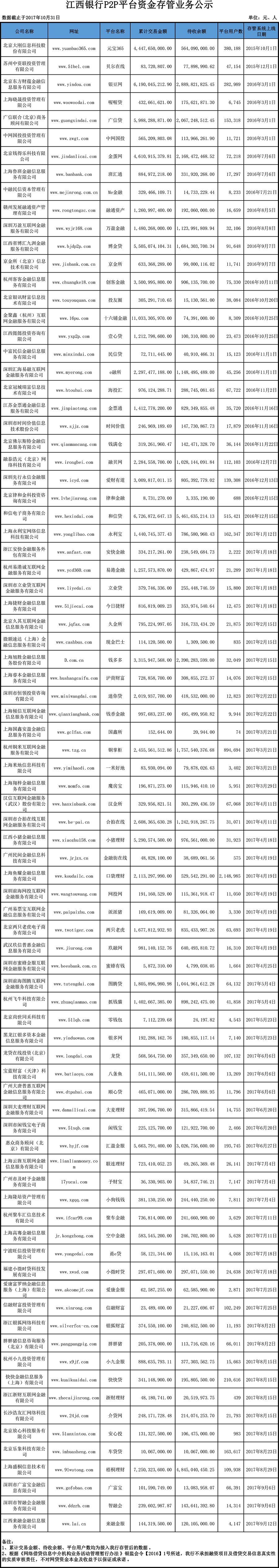 江西銀行P2P平臺資金存管業務公示 (2017年10月)