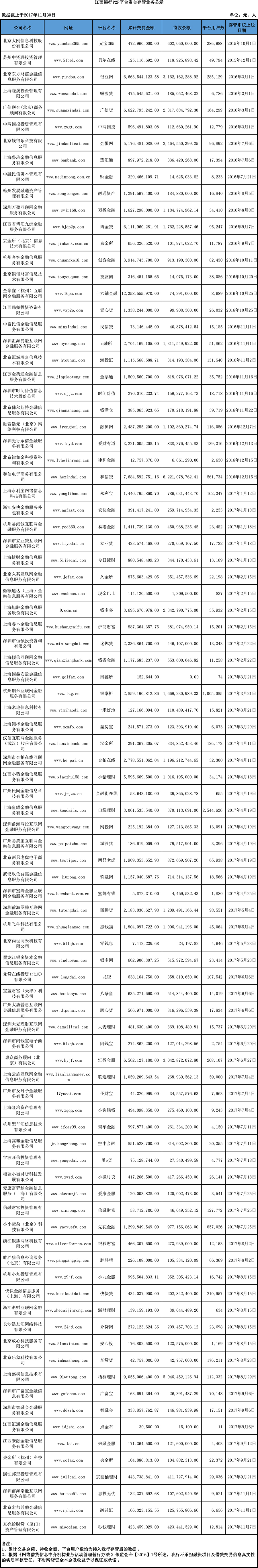 江西銀行P2P平臺資金存管業務公示 (2017年11月)