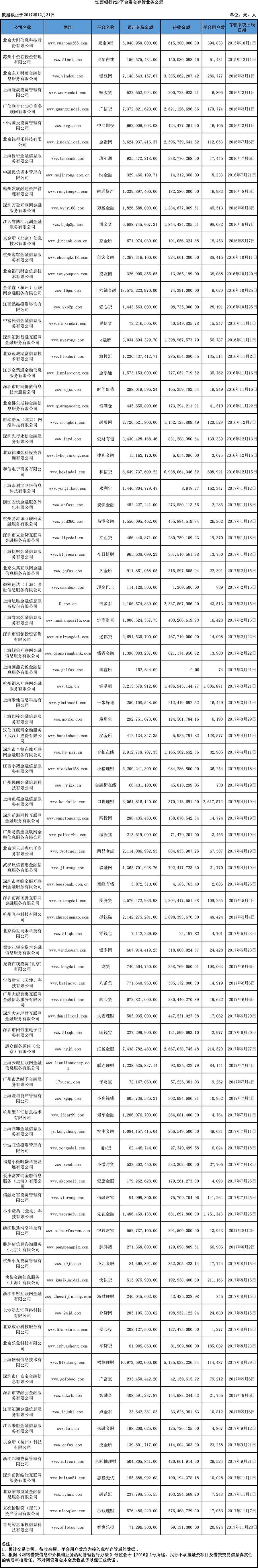 江西銀行P2P平臺資金存管業務公示(2017年12月)