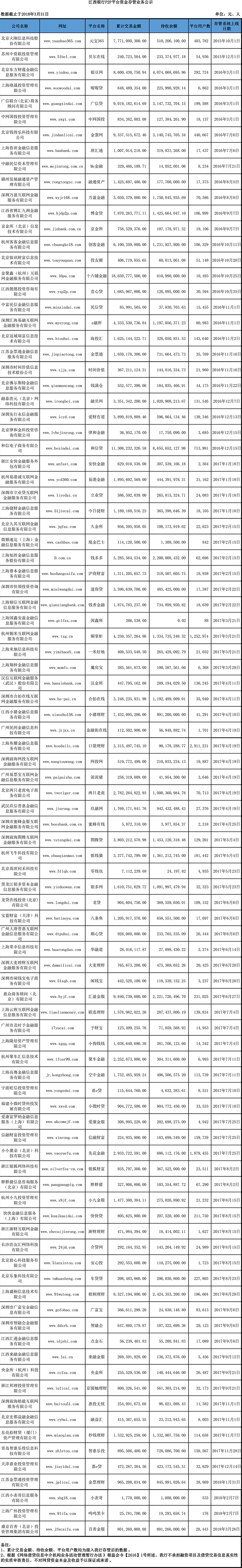 江西銀行P2P平臺資金存管業務公示(2018年3月)