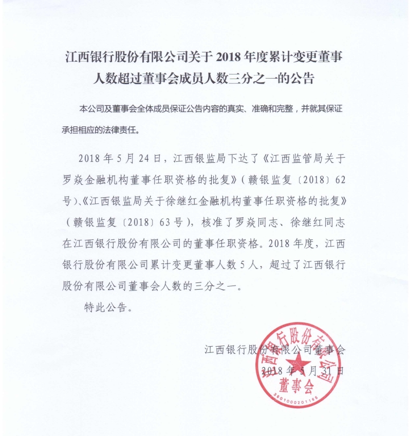 江西銀行股份有限公司關于2018年度累計變更董事人數超過董事會成員人數三分之一的公告