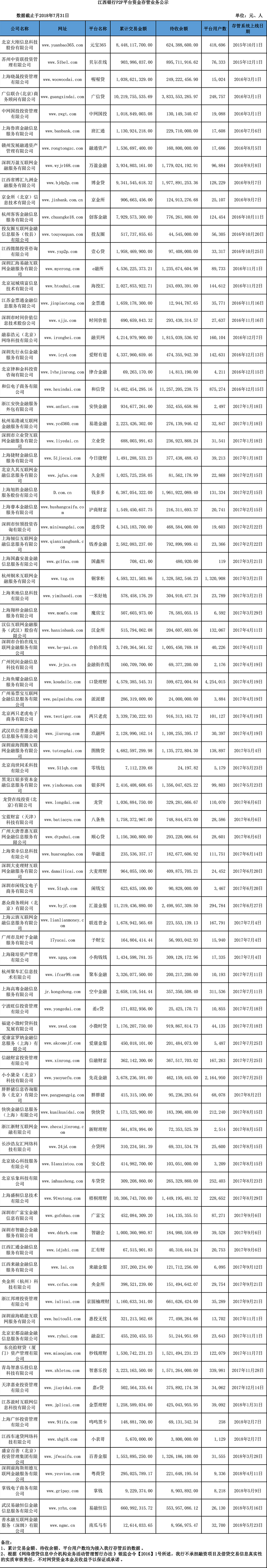 江西銀行P2P平臺(tái)資金存管業(yè)務(wù)公示(2018年7月)