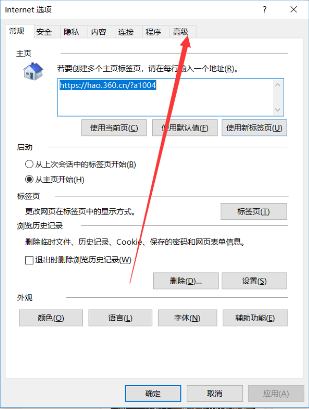 1、打開IE瀏覽器,選擇“設置”菜單的“Internet選項”,打開選項卡后選擇“高級”頁面: