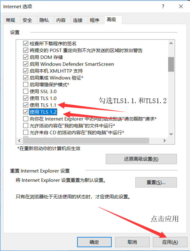 2、在“高級”頁面下的設置列表中找到“使用TLS1.1”和“使用TLS1.2”選項,勾選兩個選項前的復選框,然后點擊右下方的“應用”按鈕。